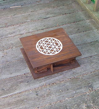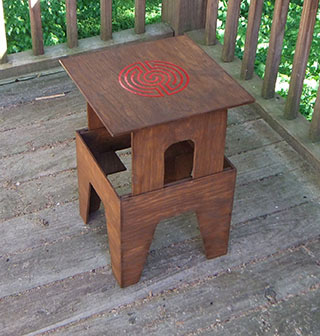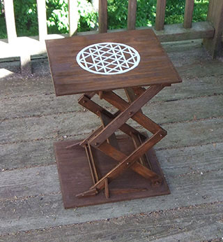 I was asked to make some end tables that could be tucked away under some chairs and then brought out and extended to be higher. I tried two designs. One design involves a top with flaps that drop down and fit into slots. The other is a basic scissor jack idea. |