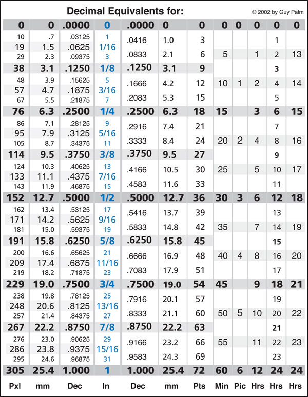 | I wanted a conversion chart with visual dividers to help find each number. Originally it was just a decimal equivalent chart, but then I added points, and then added clock times, and then added the 304.8 ppi used by our print department to equal 120 ppc. |