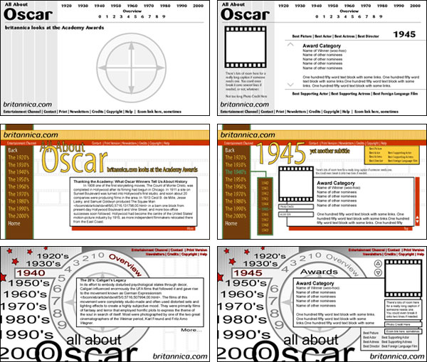 | Here are three brainstormed ideas for an interactive project. It was for a piece about the history of the Oscar Awards. A method of picking any date in its history needed to be invented, along with places to show pictures and text. Everyone was supposed to come up with one idea, but, when my creative juices get flowing I come up with more. |